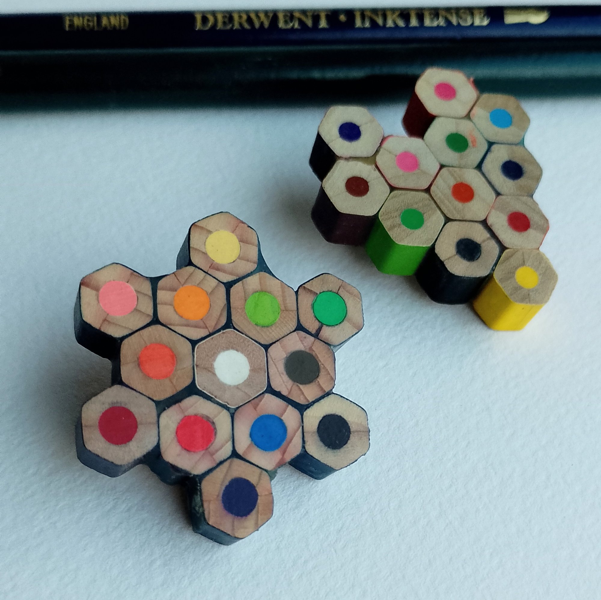 A badge made using recycled colouring pencils. We use factory reject Derwent pencils which we combine together to make colourful blocks that are then cut and shaped by hand.