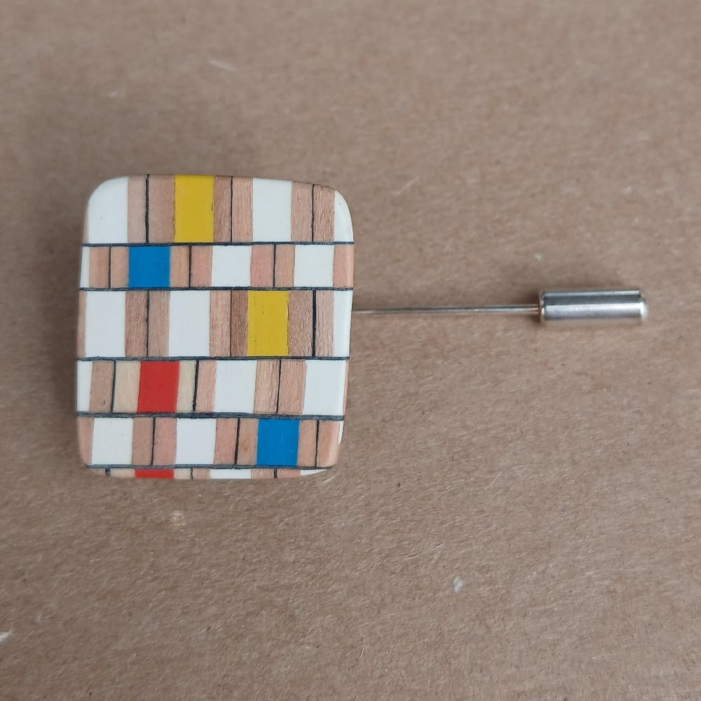 Mondrian Miniature Brooch Pin — Recycled Colouring Pencils & Paper with a Warm Walnut Backing