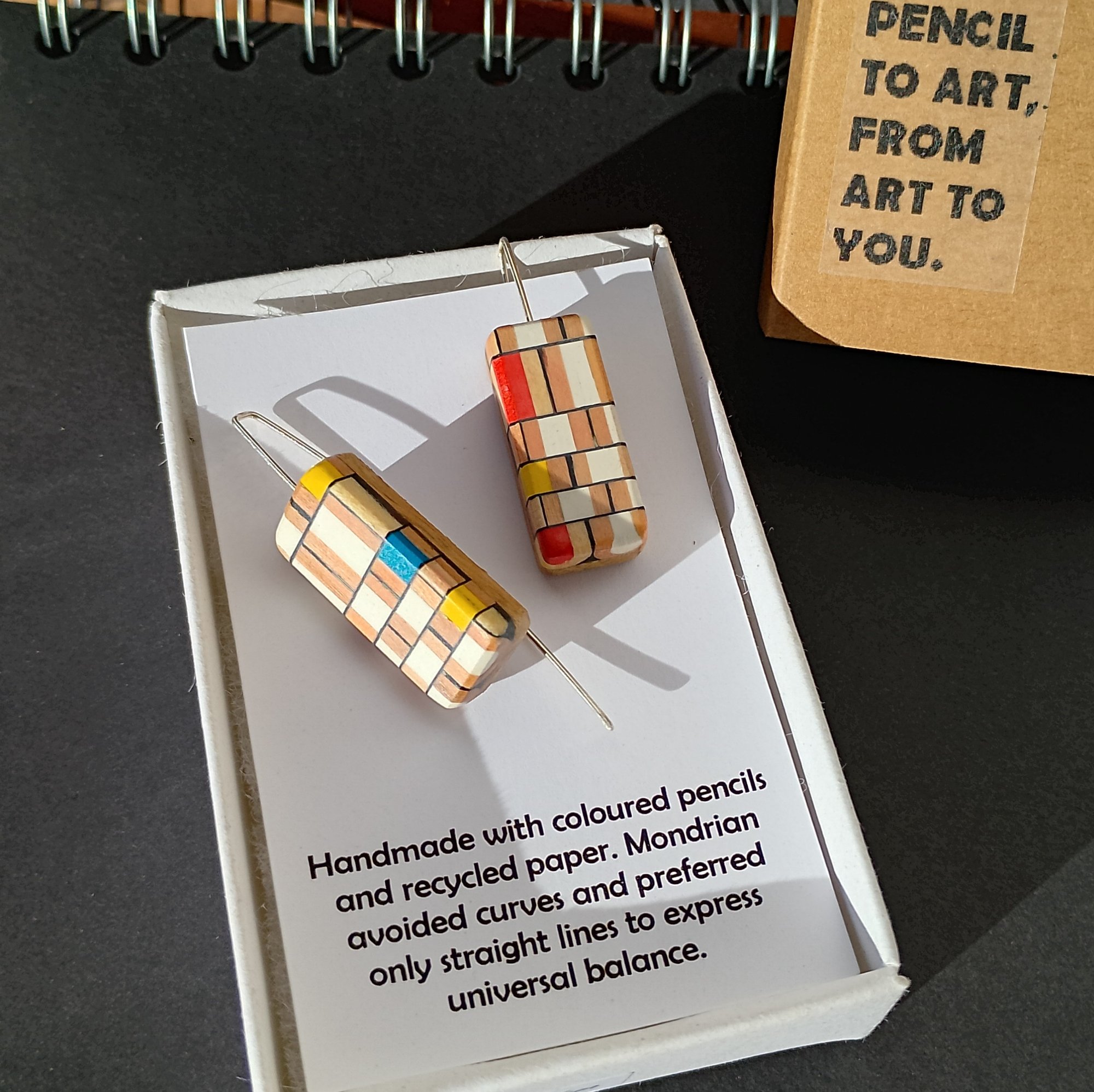 A pair of tiny modernist compositions, these lightweight earrings are inspired by Mondrian’s iconic grids and vibrant colour blocks. Each piece is meticulously handcrafted from recycled Derwent colouring pencils and paper set within bioresin and backed withwarm walnut wood, transforming everyday materials into small `wearable artworks´.