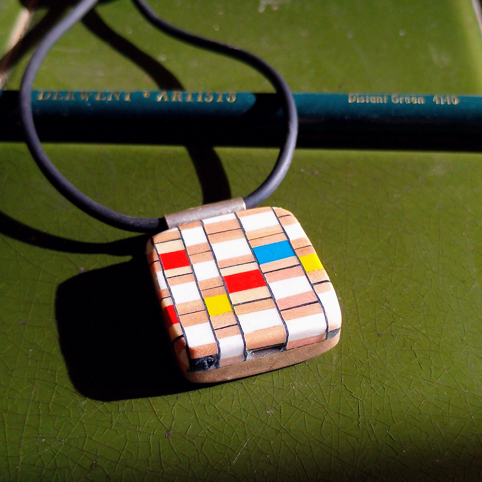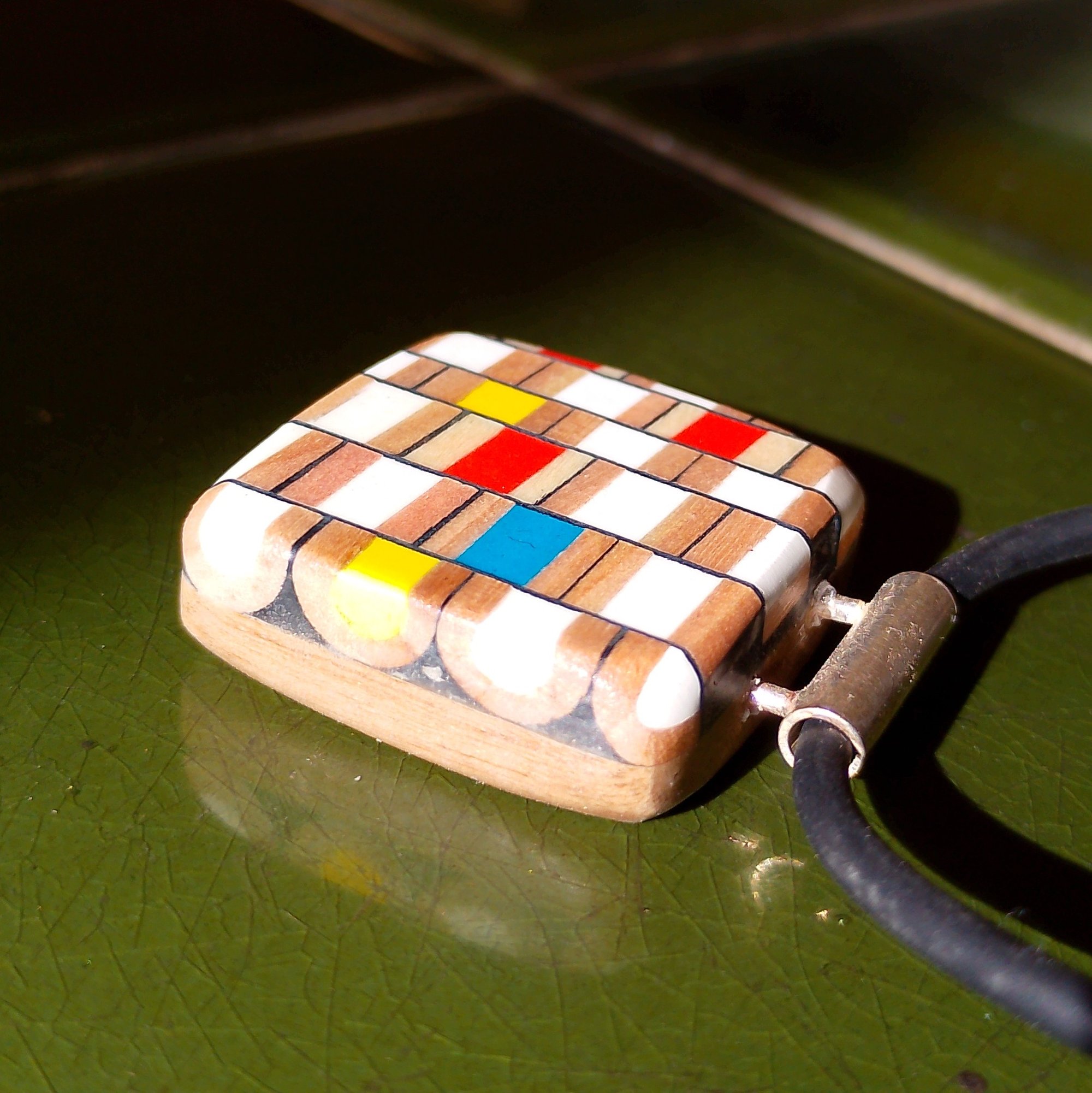 A tiny homage to Mondrian's iconic geometry, this handcrafted pendant captures colour, balance and clean design in a 25x25mm square. Each piece is made from recycled Derwent colouring pencils and paper carefully inlaid with bioresins and backed with rich walnut wood - transforming humble, discarded materials into a contemporary ´wearable artwork´.