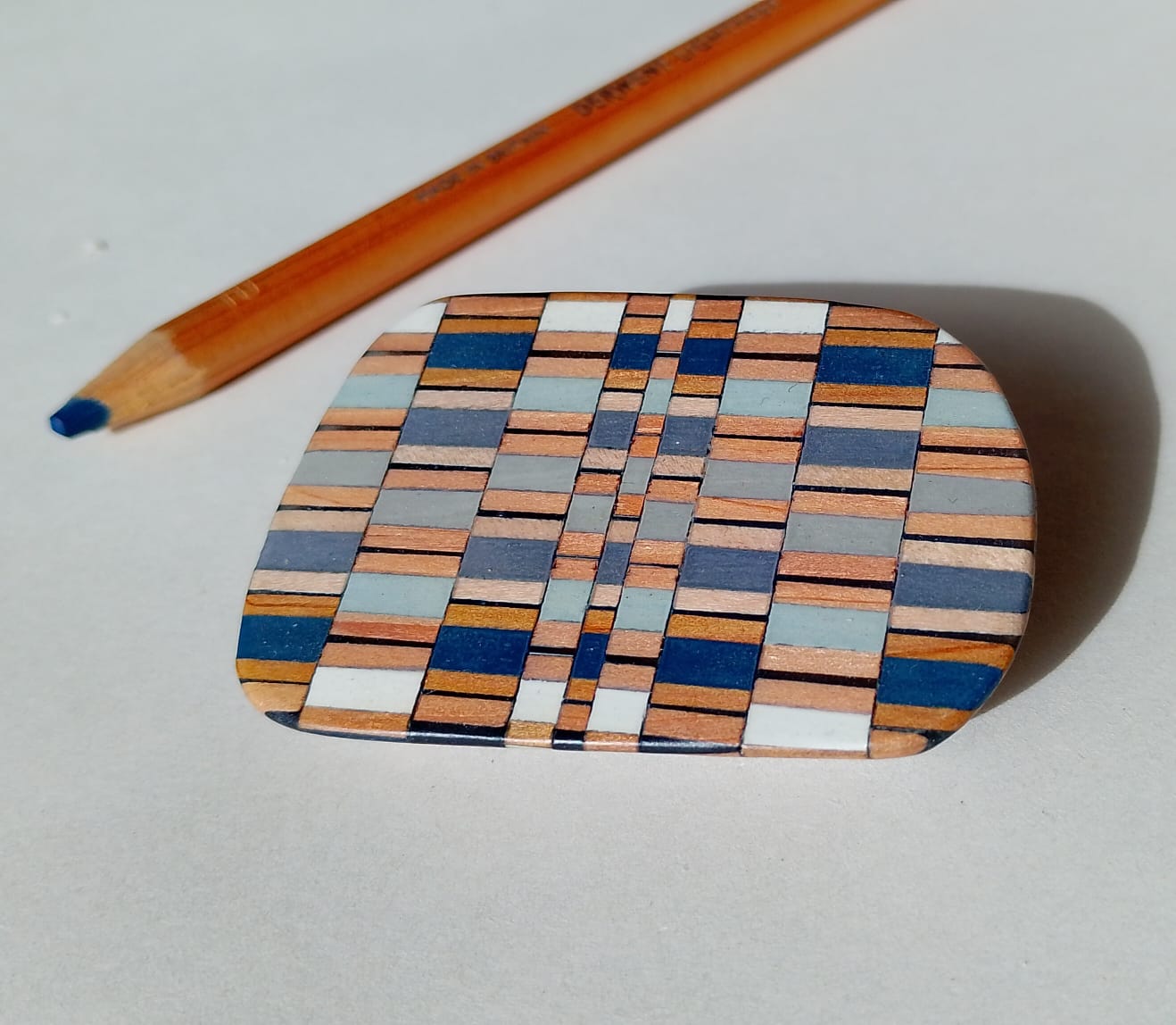 An statement brooch handmade from recycled colouring pencils, featuring a vibrant monochrome geometric pattern inspired by the Op-Art movement.