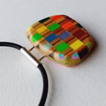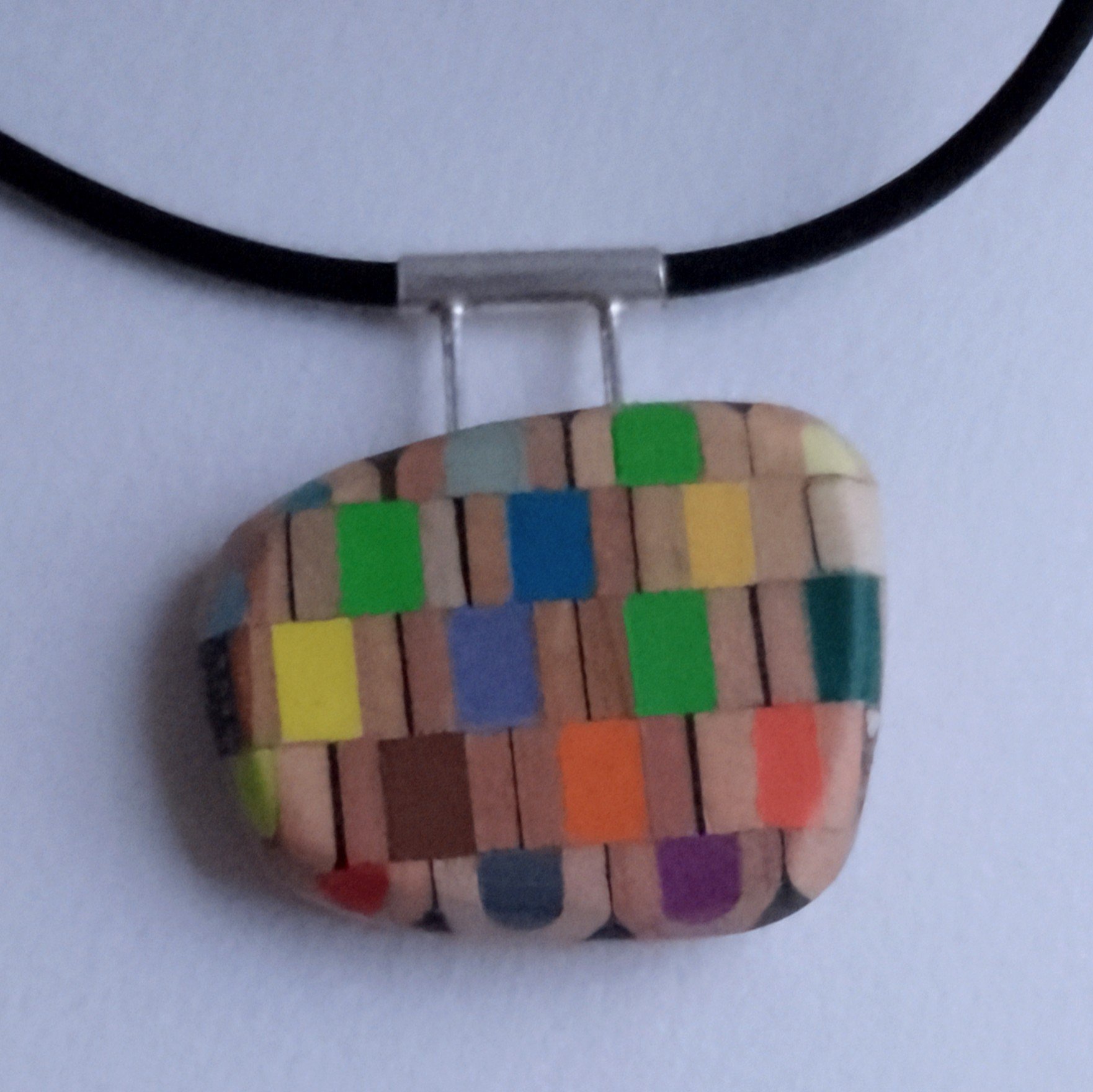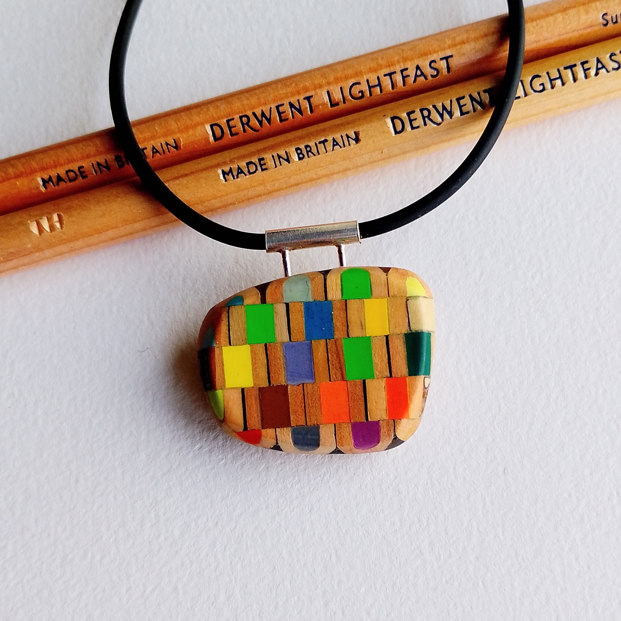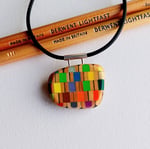 This delicate minimal multicoloured chequered pendant is made with factory rejected 'Derwent' pencils.