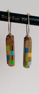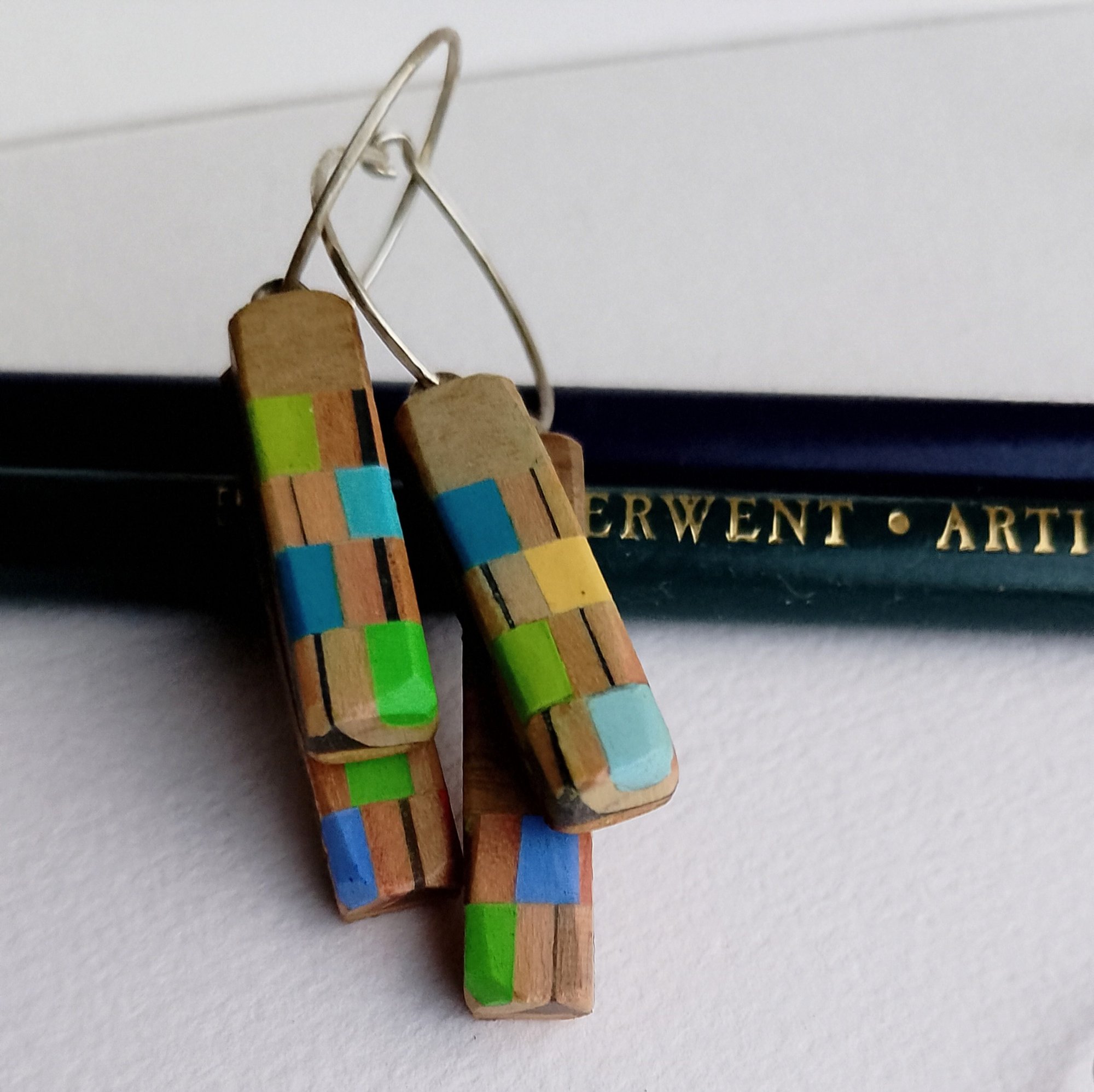 Handmade in our studio with factory rejected artist quality `Derwent´ pencils in blues, greens and straw yellow colours. Being made from pencils means they are superlight for their size and the gentle movement and colour palette makes them proper fun to wear.
